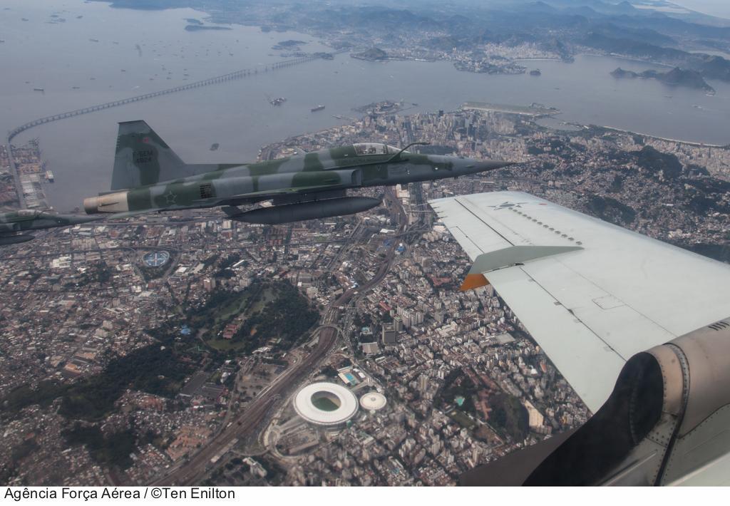 Dois caças F-5EM de alta performance da Força Aérea Brasileira (FAB) simularam a interceptação de um avião C-97 Brasília que sobrevoava o estádio do Maracanã, no Rio de Janeiro. O treinamento realizado nesta quarta-feira (29/05) é uma demonstração das ações de defesa aérea que podem acontecer caso uma aeronave descumpra as regras estabelecidas para voo em zona nas áreas restritas durante a Copa das Confederações.